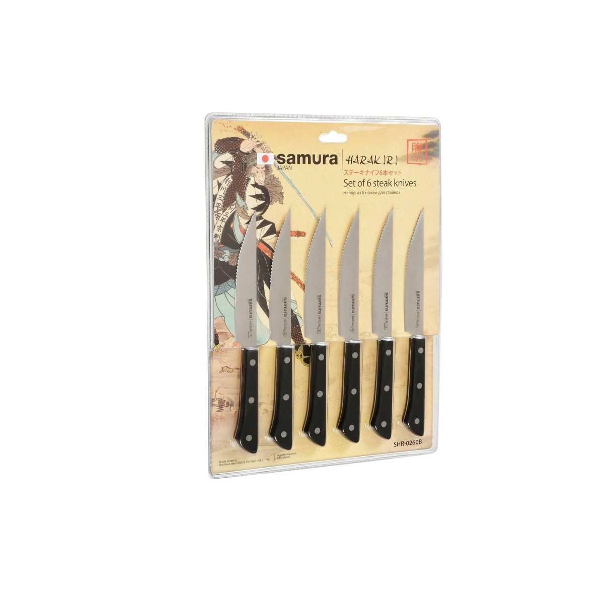 Превосходный по своей функциональности набор из серии Harakiri состоит из щести самых востребованных ножей во время праздничного ужина. Стейковыми ножами часто сервируют стол, если в меню предусмотрено мясо. Серейторная заточка тонкого лезвия эффективно справляется с мясными волокнами, позволяя гостям без проблем употреблять в пищу сложные блюда.