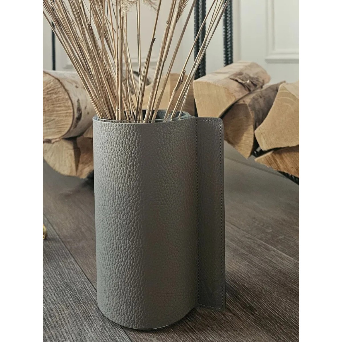 Ваза для цветов из стекла с кожаным чехлом (Италия), 20 см . Элегантная серая ваза – стильный акцент для вашего интерьера. Выполненная из высококачественного стекла и дополненная чехлом из регенерированной кожи, она сочетает в себе изысканный дизайн и практичность. Итальянское производство гарантирует безупречное качество и внимание к деталям.