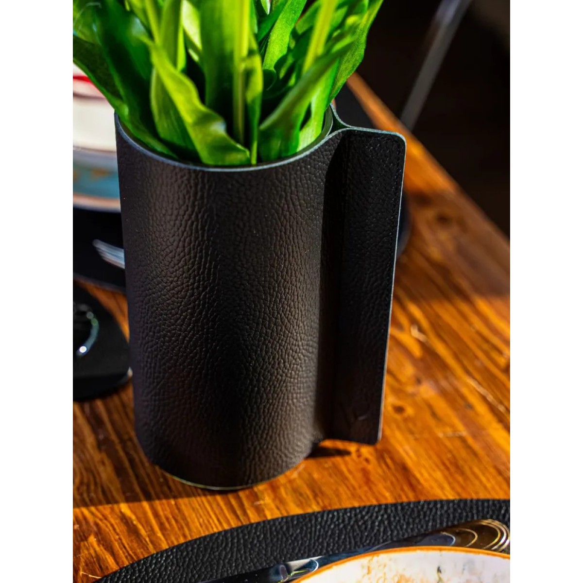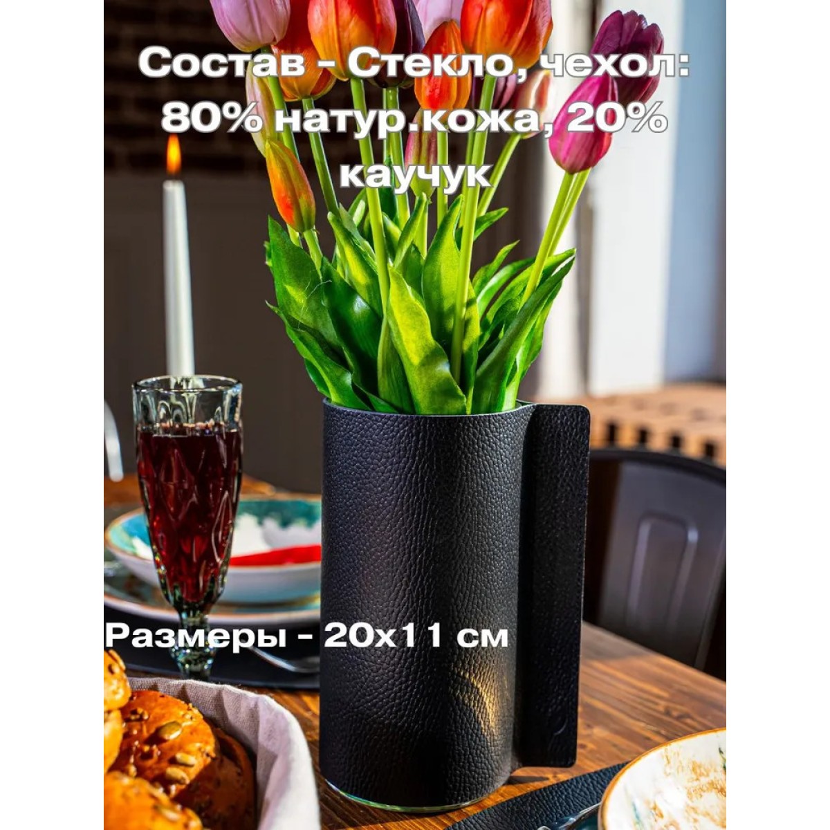 Ваза для цветов из стекла с кожаным чехлом (Италия), 20 см . Элегантная черная ваза – стильный акцент для вашего интерьера. Выполненная из высококачественного стекла и дополненная чехлом из регенерированной кожи, она сочетает в себе изысканный дизайн и практичность. Итальянское производство гарантирует безупречное качество и внимание к деталям.
