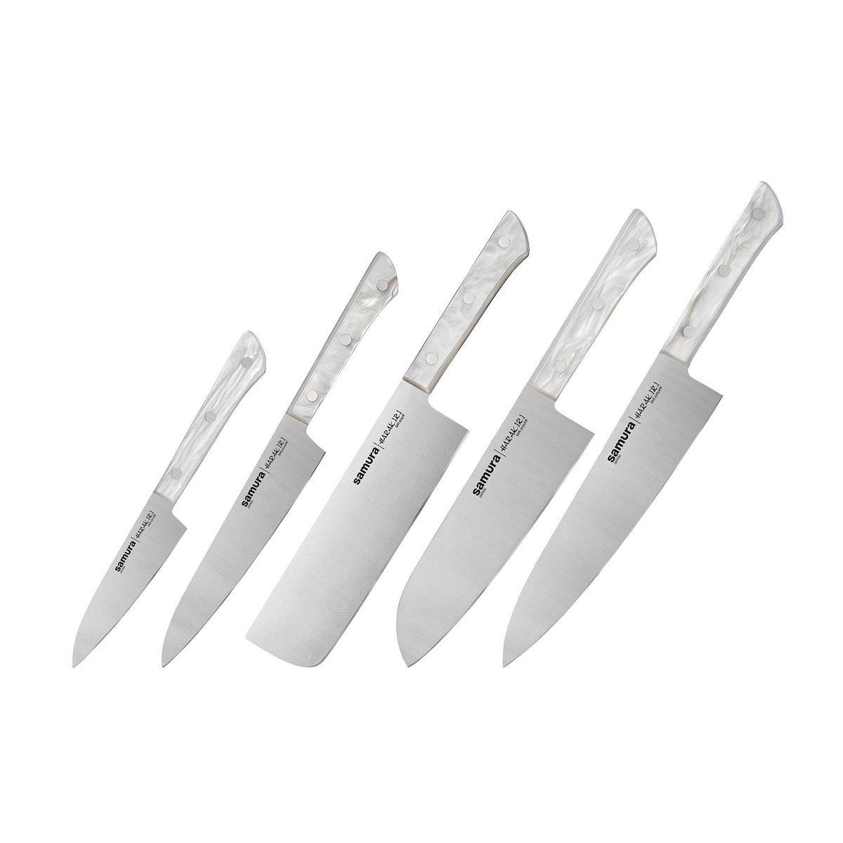 Превосходный по своей функциональности набор из серии Harakiri состоит из пяти самых востребованных видов ножей: овощного, универсального и европейского шеф-ножа, составляющих незаменимую "Поварскую тройку", а также традиционных японских разновидностей – накири и сантоку.