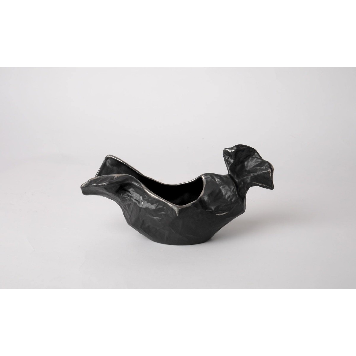 Молочник или соусник черного цвета из коллекции посуды "Нефть" МАЛЫЙ объёмом 100 мл, расписанный платиной по кайме- внутри черный, является переосмыслением коллекции "Фантики". Идея заключалась в сочетание несочетаемого, мятой бумаги - фантика, выполненного из твердого и, в тоже время, просвечиваемом фарфора.